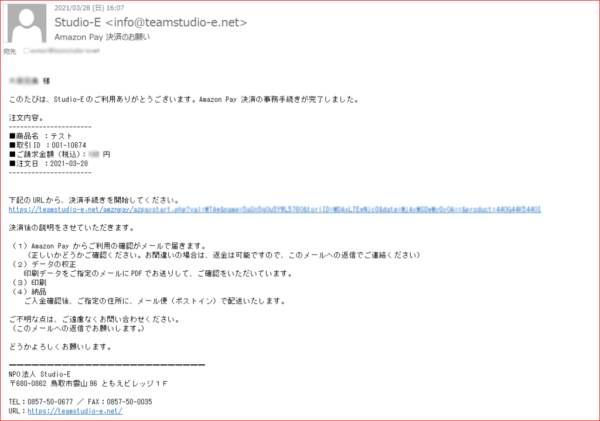 2)ご注文後、Studio-Eから 決済用URLがメールで届く(申し込みの翌日かその次の日)
