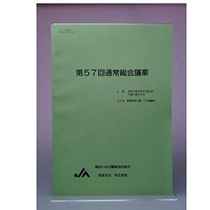 :第57回柿生産部通常総会議案 A4 P22+4 表紙 色上質特厚 通常色 本文 上質70㎏ 全黒1色  ※通常色とはクリーム、桜、銀鼠、水色、りんどう、や