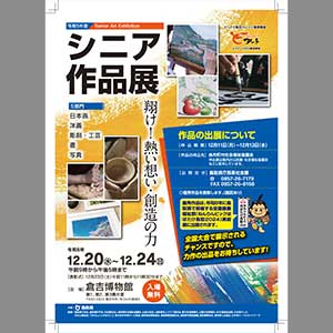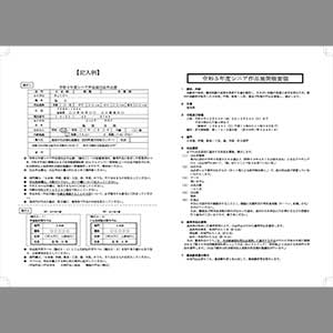 シニア作品展の広報物の印刷①ポスター ②チラシ ③開催要領 ④ 出品申込書およびラベル ⑤開催要領への差込作業
